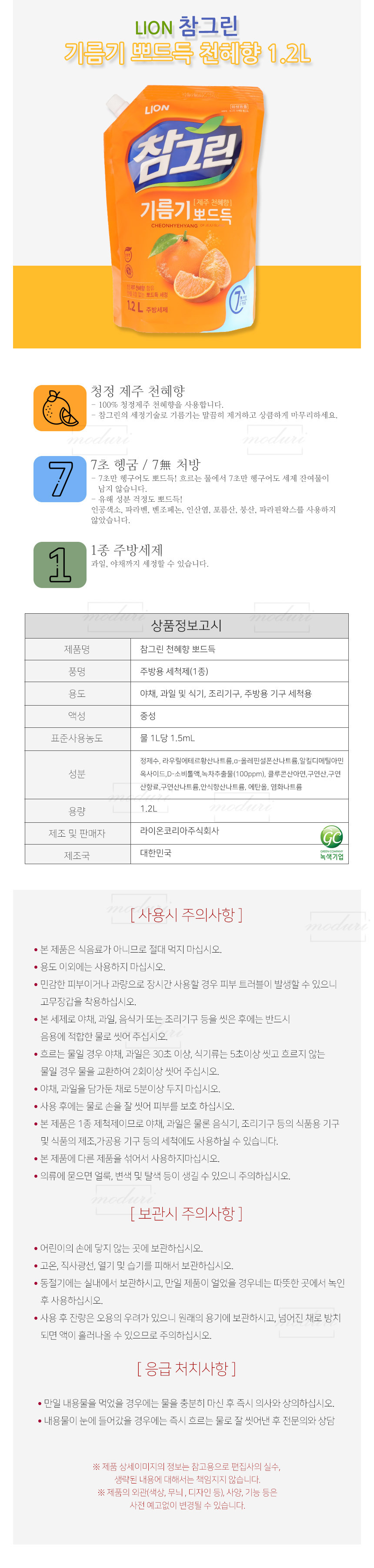 참그린 기름기뽀드득 천혜향 1.2L 주방세제 설거지