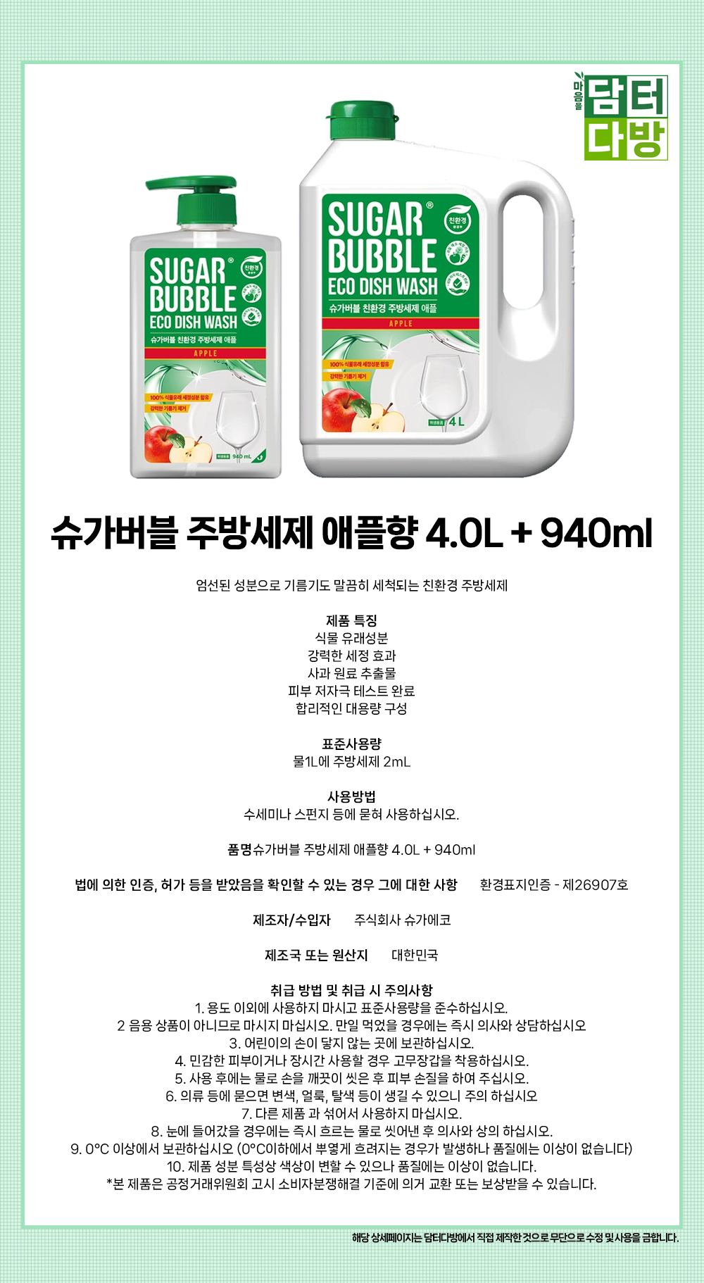 슈가버블 주방세제 애플향 4.0L + 940ml