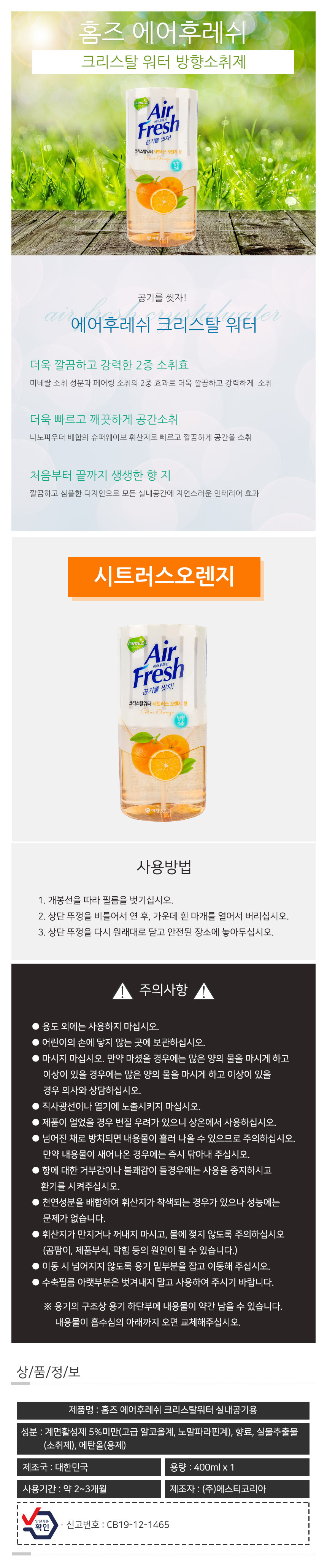 홈즈 에어후레쉬 크리스탈워터 방향소취제 오렌지향