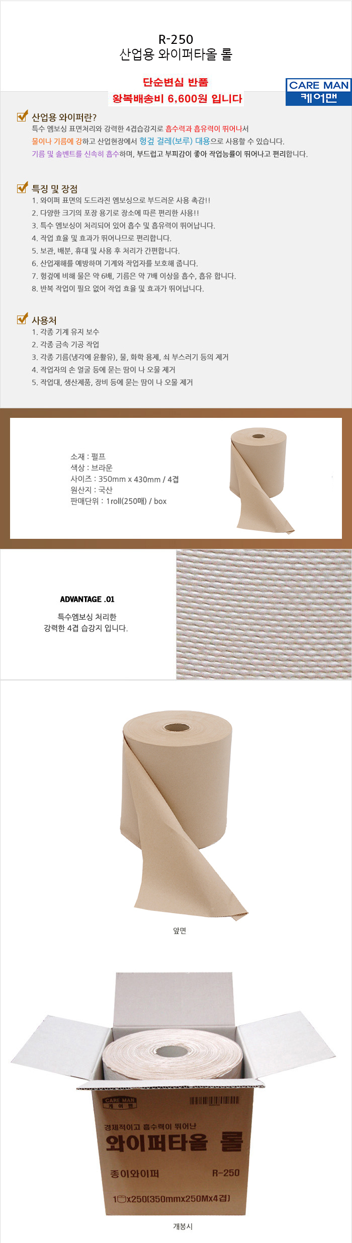 품명 및 모델명 산업용 와이퍼 흡착포 롤 핸드타올 250매