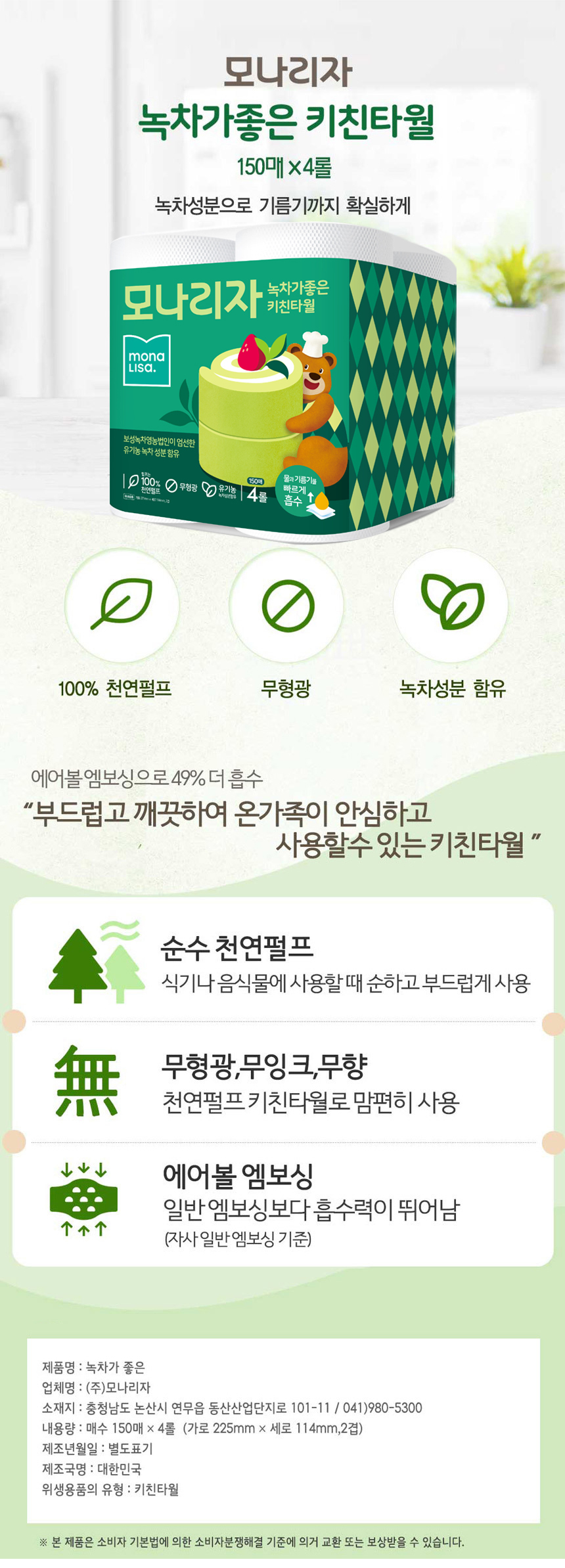 모나리자 녹차가 좋은 키친타올 150매 4롤