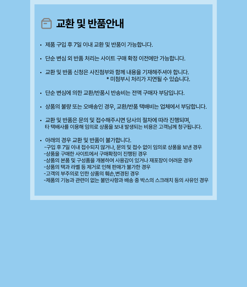 • 단순변심으로 인한 반품 시, 배송 완료 후 7일이 지나면 취소/반품 신청이 접수되지 않습니다.