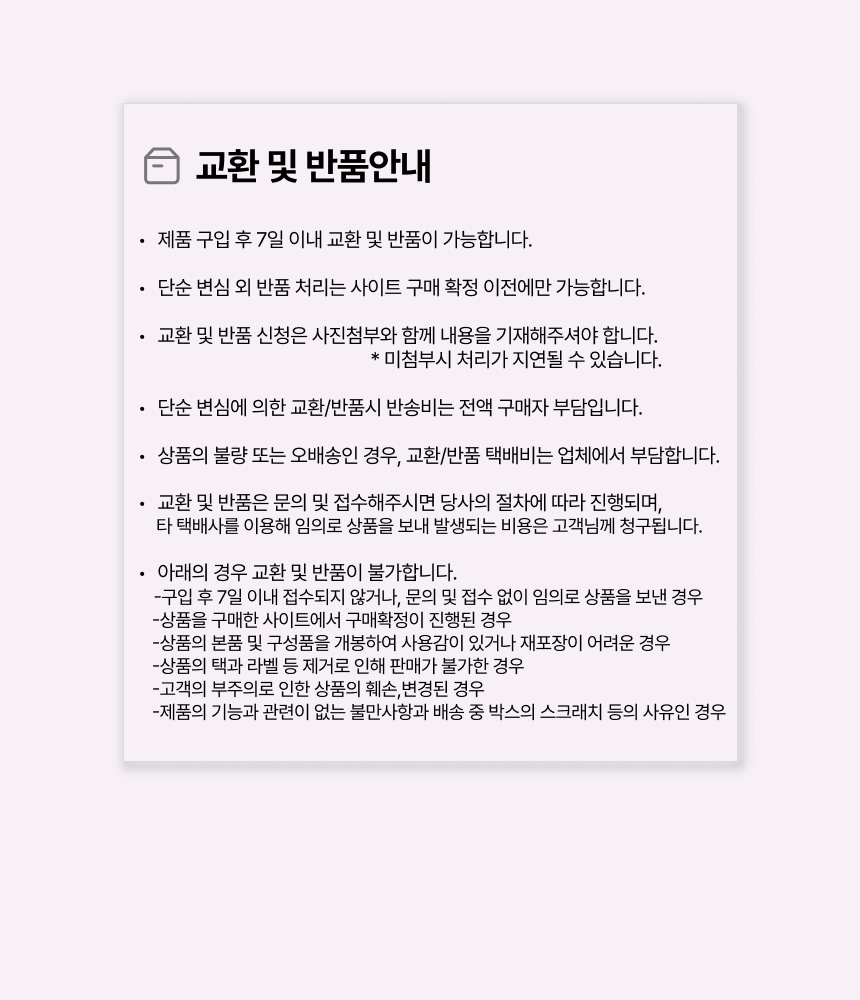 • 단순변심으로 인한 반품 시, 배송 완료 후 7일이 지나면 취소/반품 신청이 접수되지 않습니다.