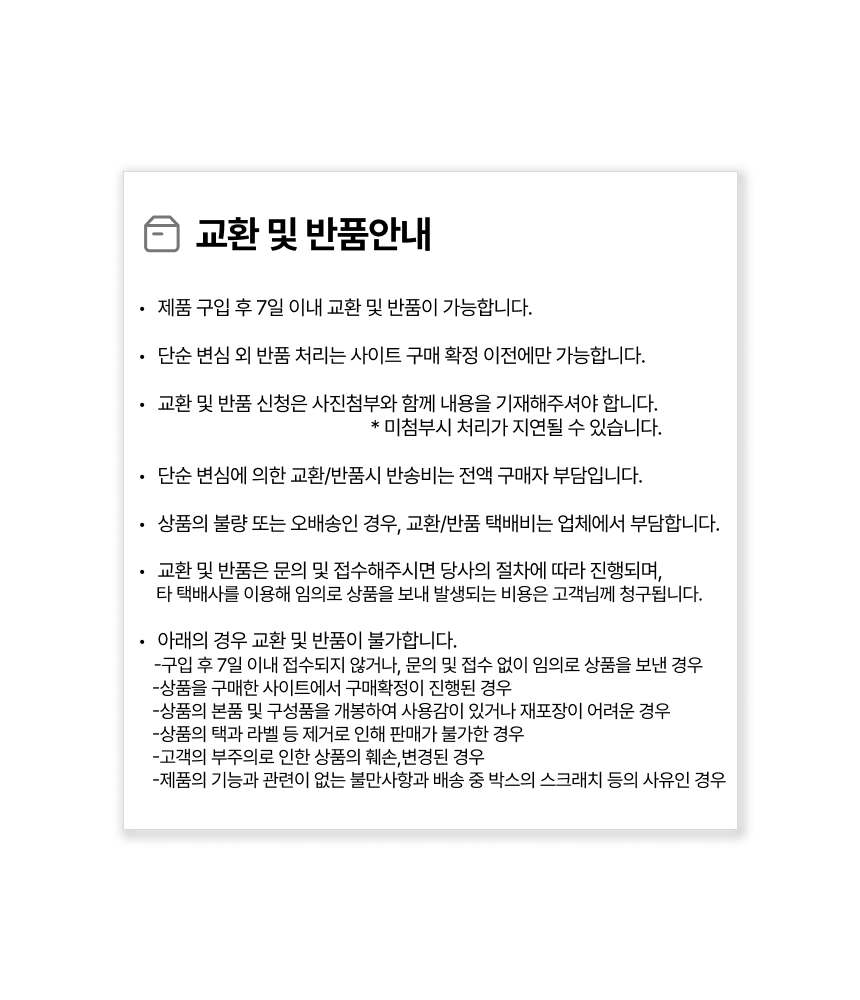 • 단순변심으로 인한 반품 시, 배송 완료 후 7일이 지나면 취소/반품 신청이 접수되지 않습니다.