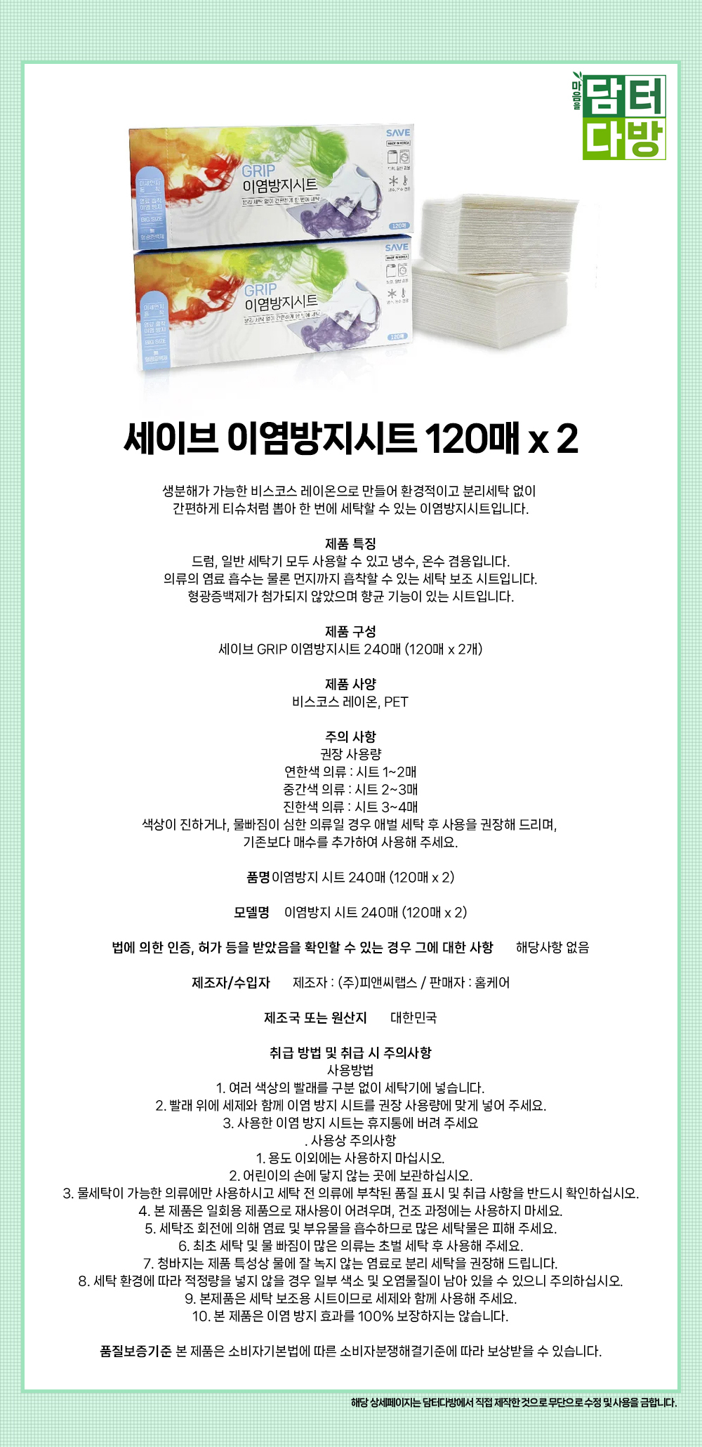 세이브 이염방지시트 120매 x 2