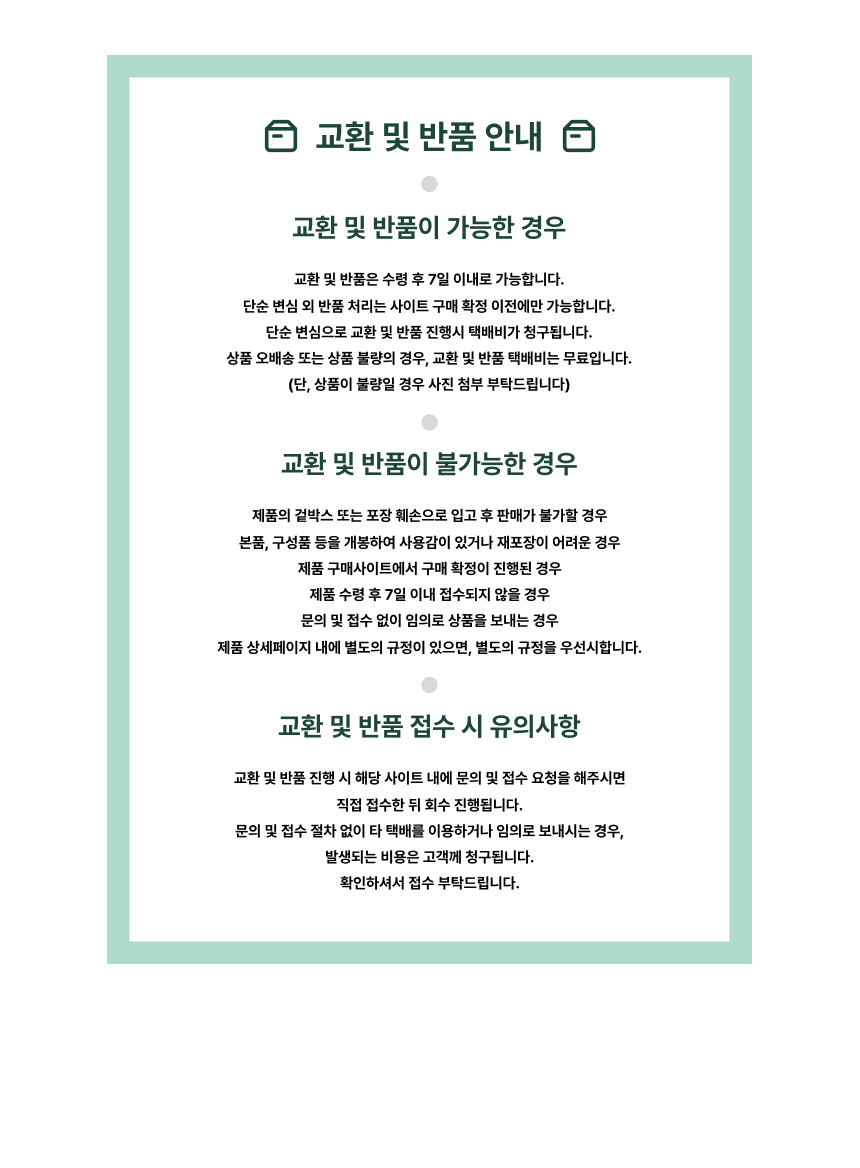 • 단순변심으로 인한 반품 시, 배송 완료 후 7일이 지나면 취소/반품 신청이 접수되지 않습니다.