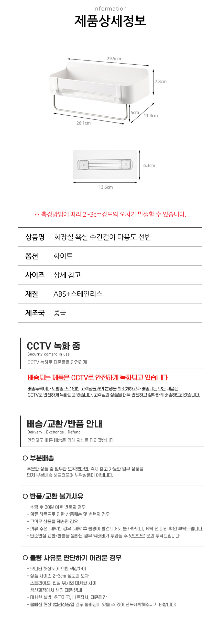 | 제품하자가 아닌 소비자의 단순변심, 착오구매에 따른 청약철회 시 소비자가 부담하는 반품비용 등에 관한 정보 | 배송ㆍ교환ㆍ반품 상세설명페이지 참고 |