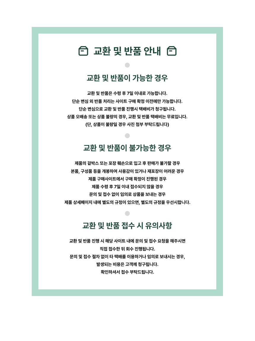 • 단순변심으로 인한 반품 시, 배송 완료 후 7일이 지나면 취소/반품 신청이 접수되지 않습니다.