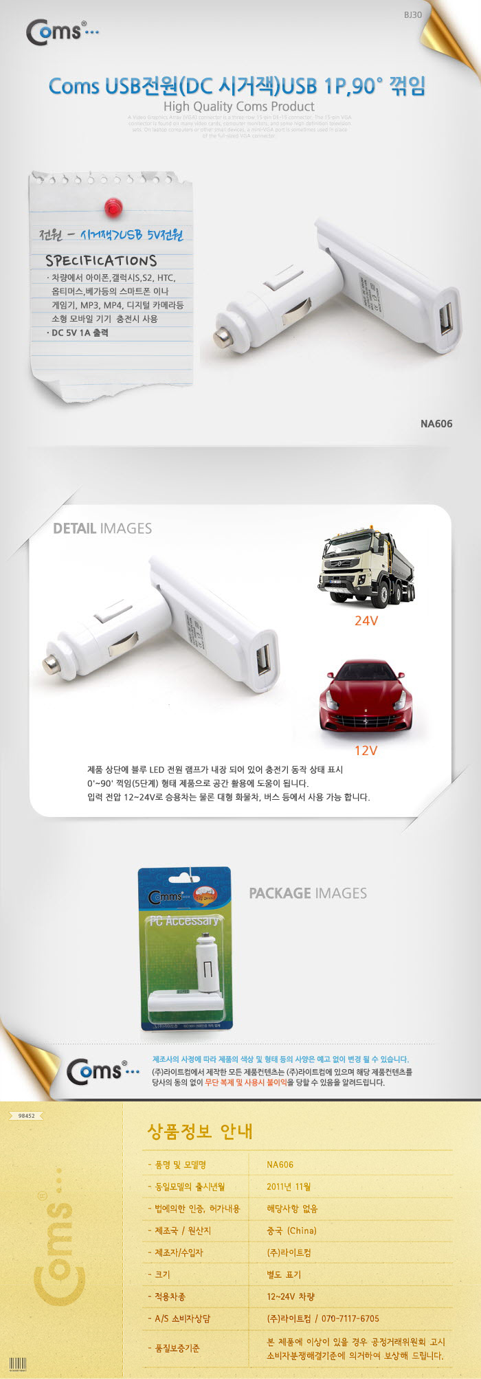 USB 전원(DC USB 시가잭)USB 1P,90° 꺾임(꺽임)/ 시거잭 NA606