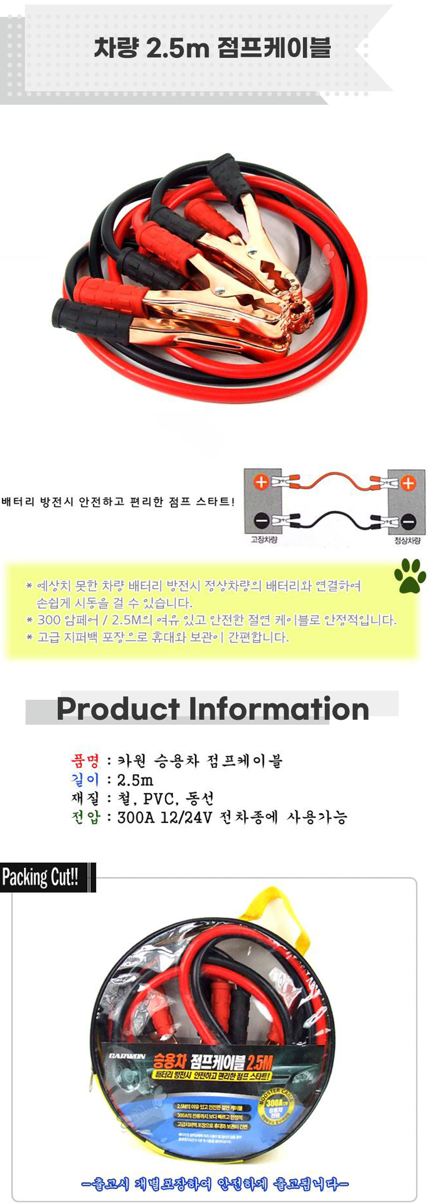 차량 2.5m 점프케이블 밧데리점프선 자동차점프케이블
