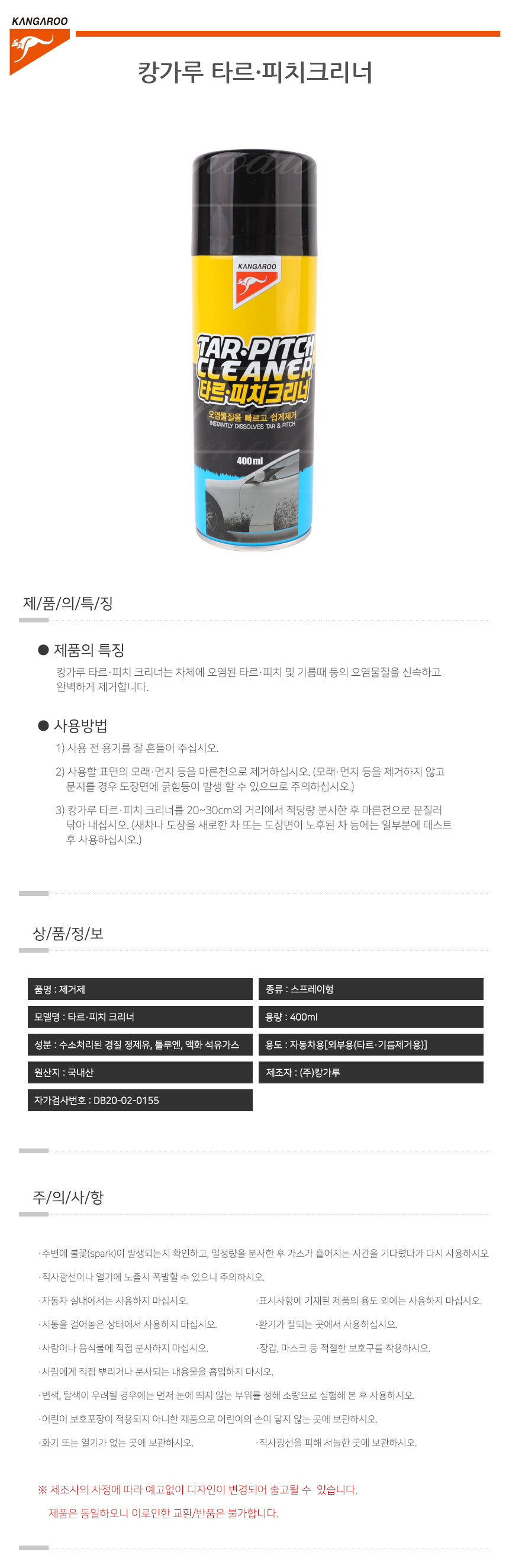 캉가루 타르 피치 크리너 400ML 스티커 주차딱지제거