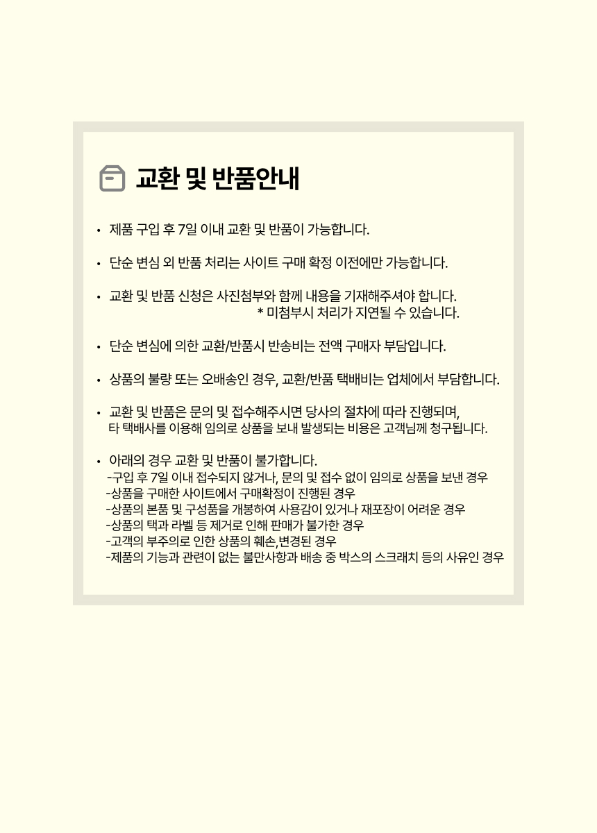 • 단순변심으로 인한 반품 시, 배송 완료 후 7일이 지나면 취소/반품 신청이 접수되지 않습니다.