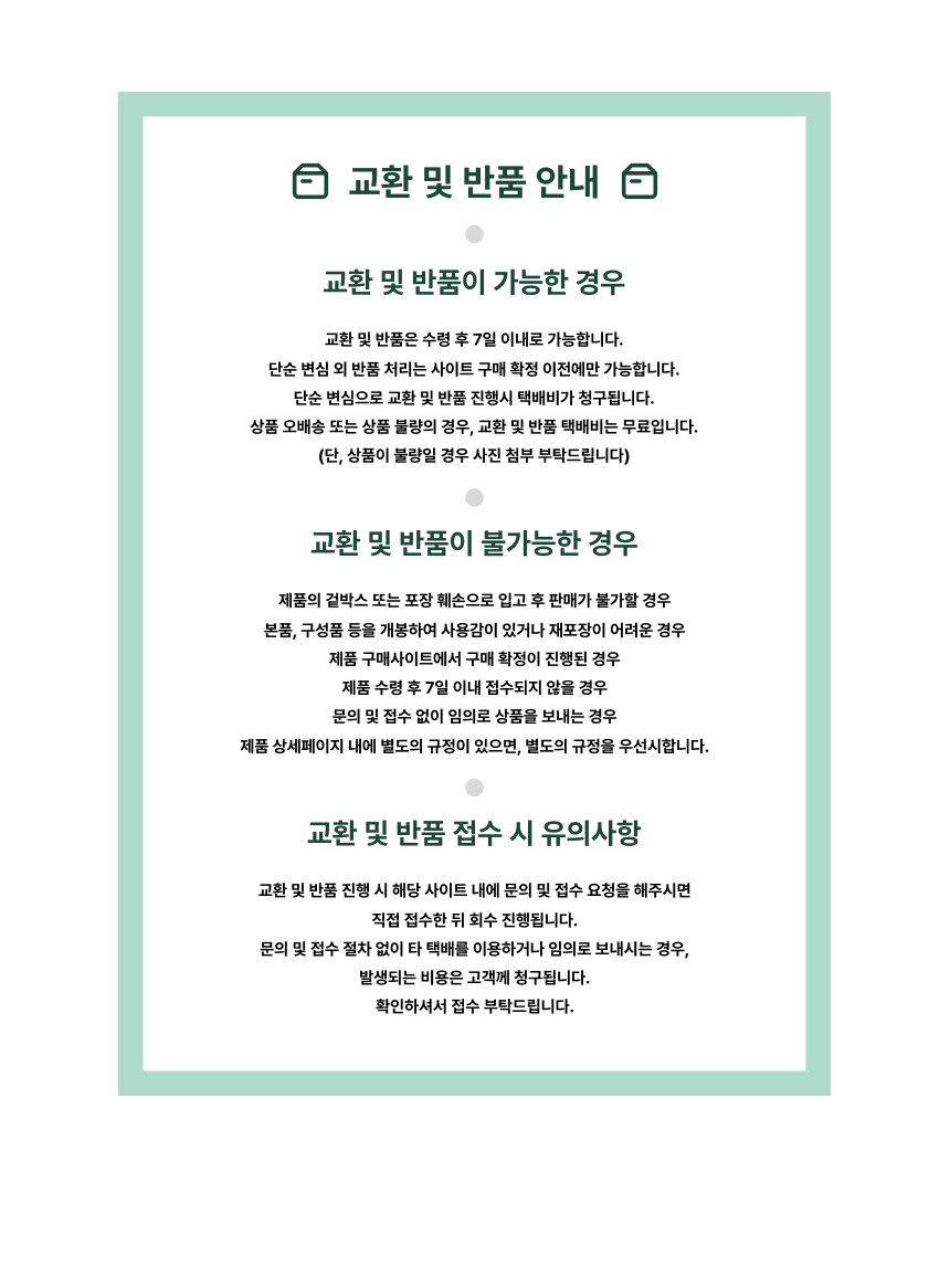 • 단순변심으로 인한 반품 시, 배송 완료 후 7일이 지나면 취소/반품 신청이 접수되지 않습니다.