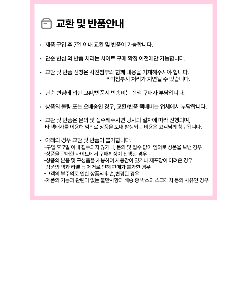 • 단순변심으로 인한 반품 시, 배송 완료 후 7일이 지나면 취소/반품 신청이 접수되지 않습니다.