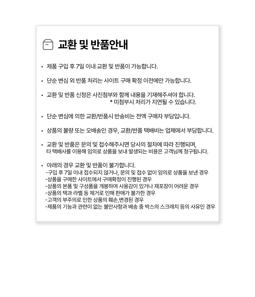 • 단순변심으로 인한 반품 시, 배송 완료 후 7일이 지나면 취소/반품 신청이 접수되지 않습니다.