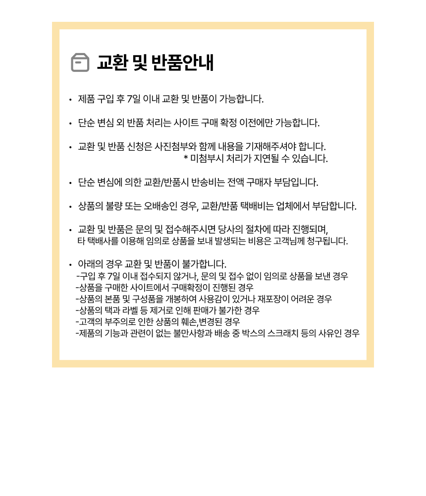 • 단순변심으로 인한 반품 시, 배송 완료 후 7일이 지나면 취소/반품 신청이 접수되지 않습니다.