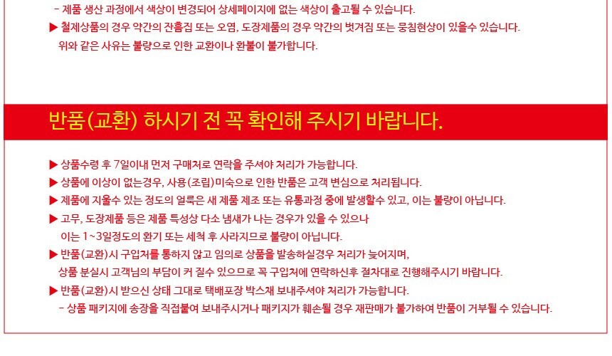 • 단순변심으로 인한 반품 시, 배송 완료 후 7일이 지나면 취소/반품 신청이 접수되지 않습니다.