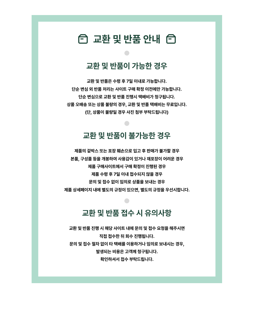 • 단순변심으로 인한 반품 시, 배송 완료 후 7일이 지나면 취소/반품 신청이 접수되지 않습니다.