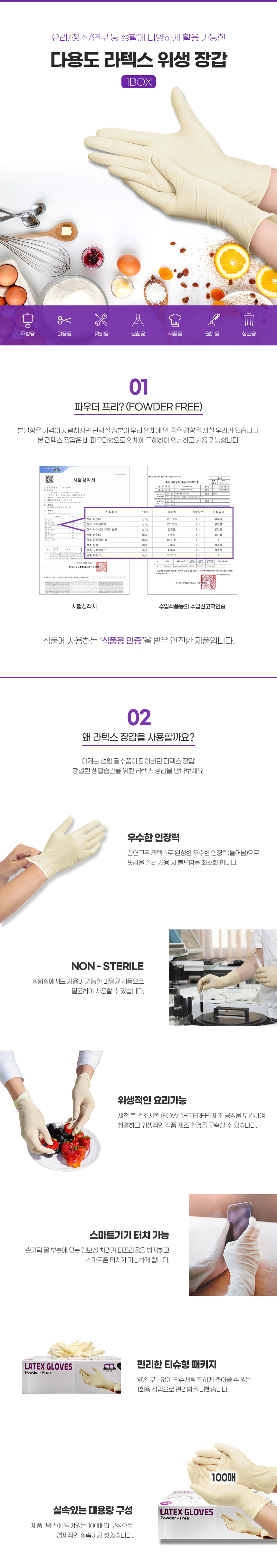 다용도 라텍스 장갑 100매 10세트(1box) 파우더프리 요리용 위생 미용 니트릴