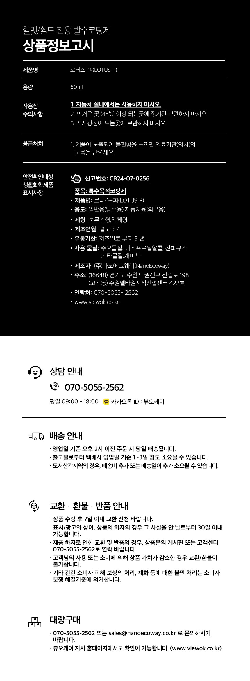 | 제품하자가 아닌 소비자의 단순변심, 착오구매에 따른 청약철회 시 소비자가 부담하는 반품비용 등에 관한 정보 | 배송ㆍ교환ㆍ반품 상세설명페이지 참고 |