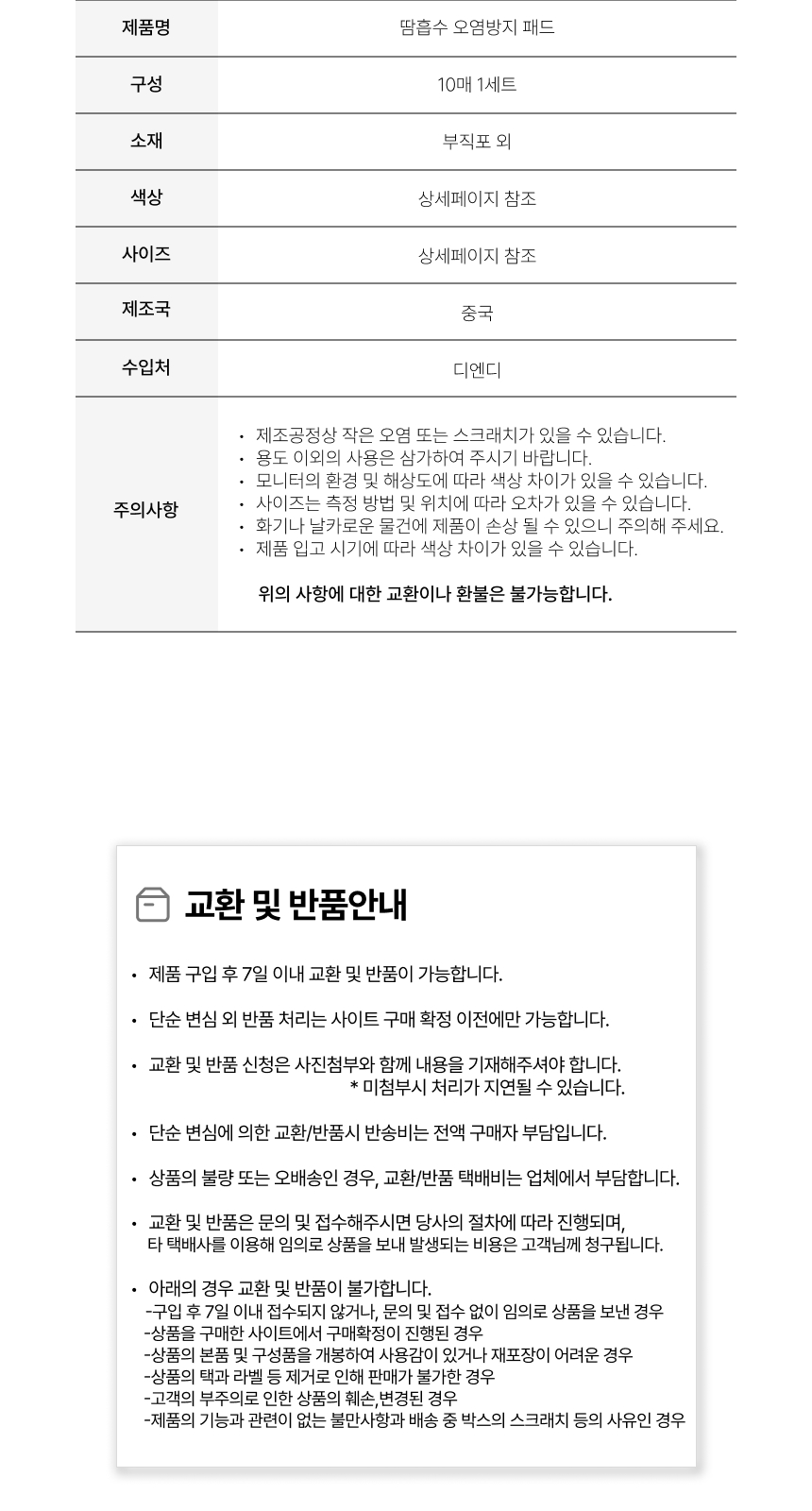 | 제품하자가 아닌 소비자의 단순변심, 착오구매에 따른 청약철회 시 소비자가 부담하는 반품비용 등에 관한 정보 | 배송ㆍ교환ㆍ반품 상세설명페이지 참고 |