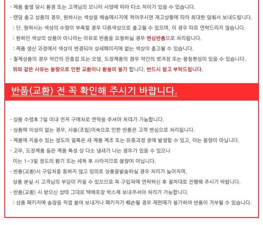 • 단순변심으로 인한 반품 시, 배송 완료 후 7일이 지나면 취소/반품 신청이 접수되지 않습니다.