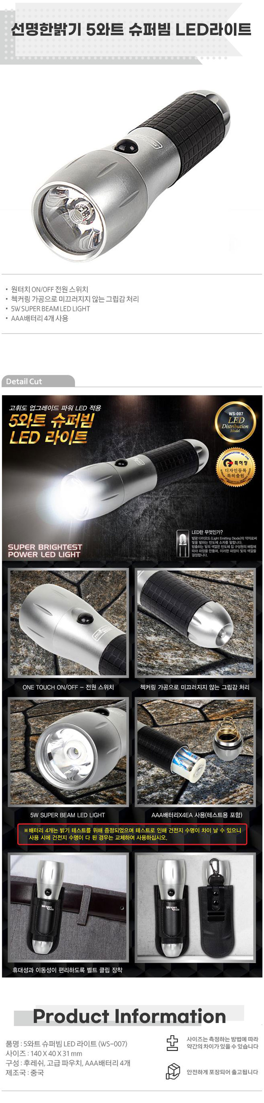선명한밝기 5와트 슈퍼빔 LED라이트 캠핑손전등 LED등