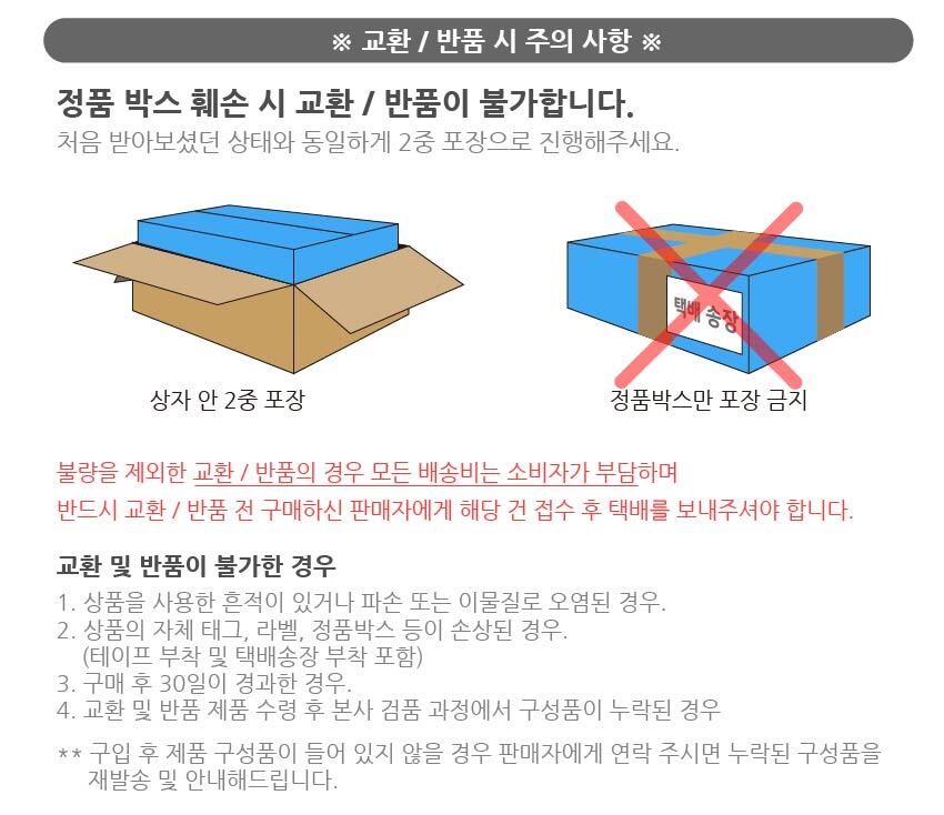 • 단순변심으로 인한 반품 시, 배송 완료 후 7일이 지나면 취소/반품 신청이 접수되지 않습니다.