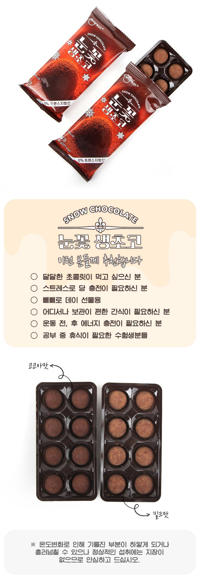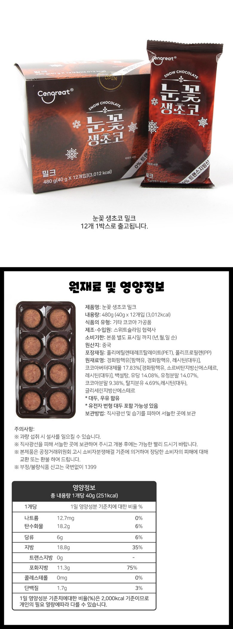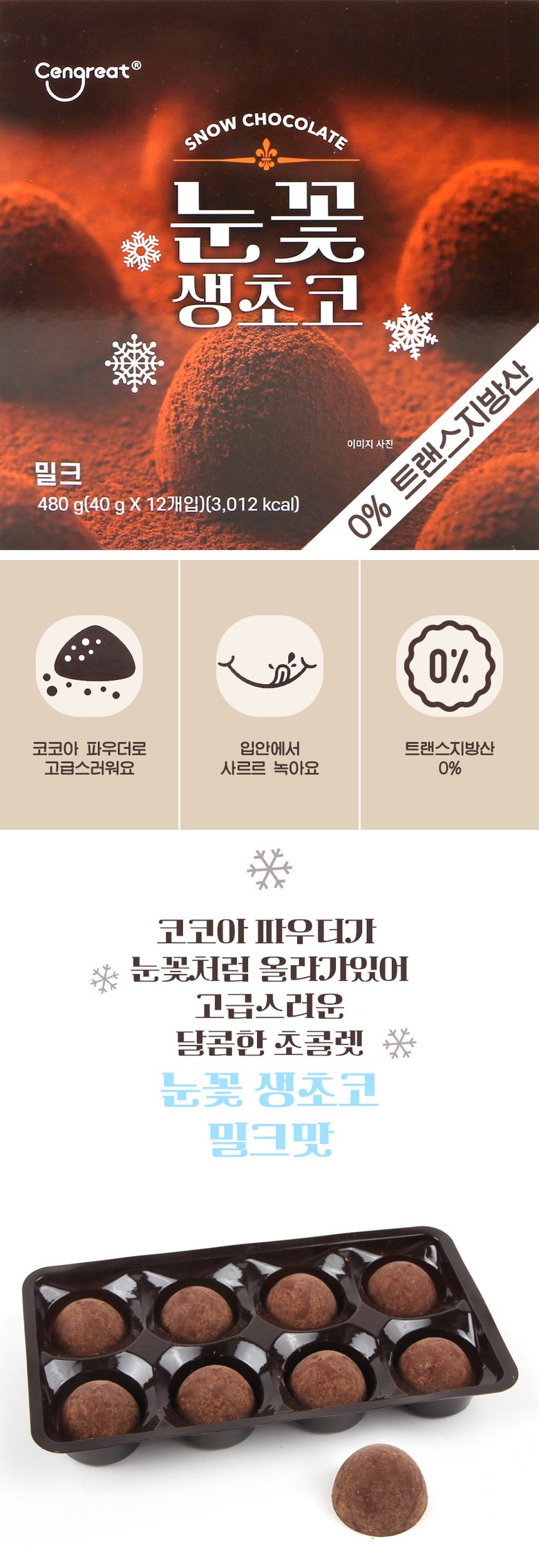 무배) 눈꽃 생초코 밀크 초콜릿 40g X 12개 신상품