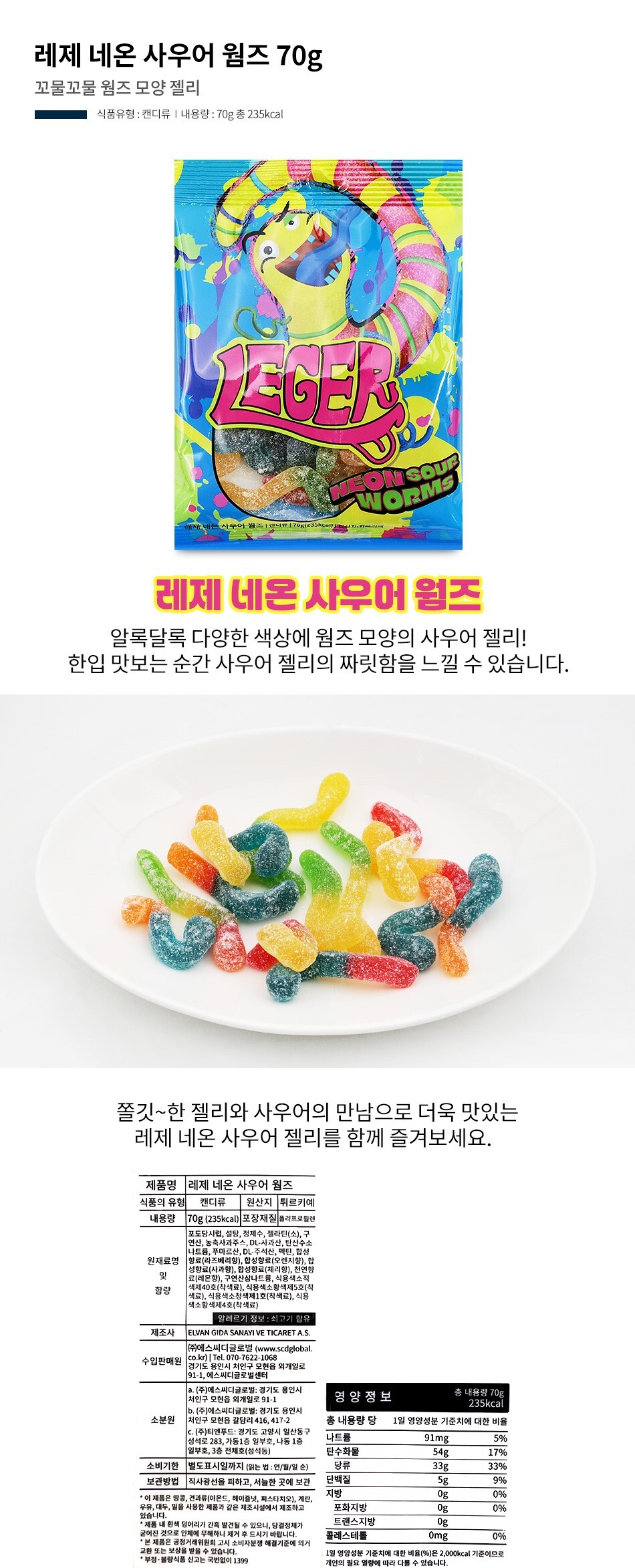 무배) 레제 네온 사우어 웜즈 70g X 3개 수입젤리