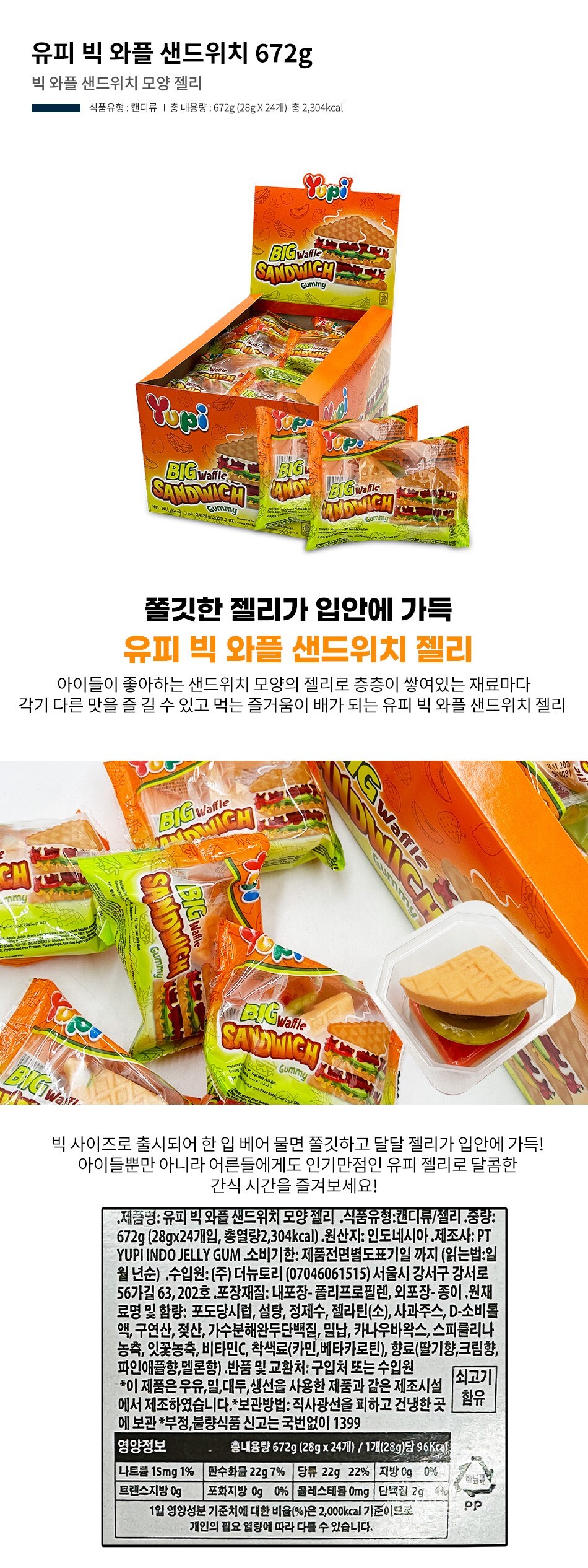 무배) 유피 빅 와플 샌드위치 모양 젤리 672g (28gx24개) (1통)