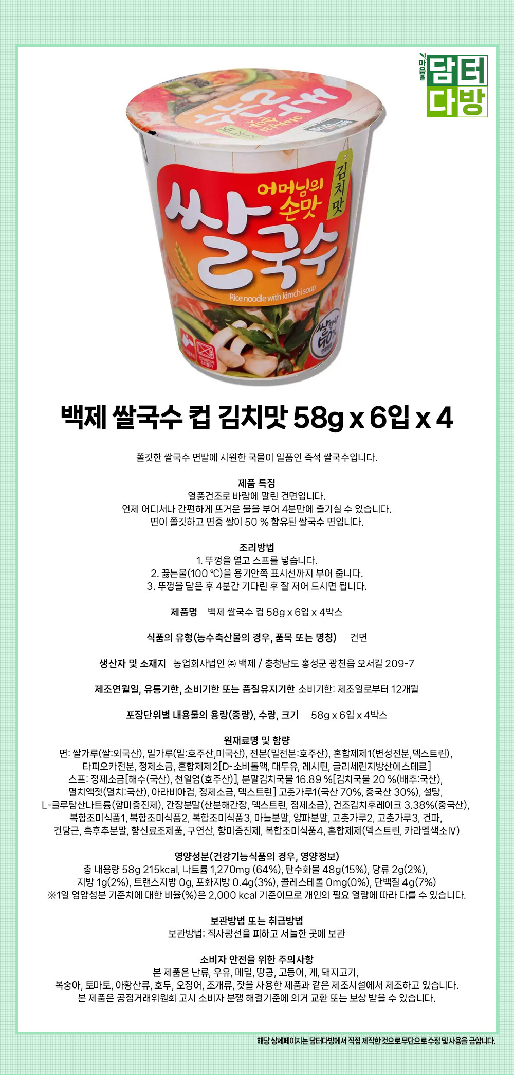 백제 쌀국수 컵 김치맛 58g x 6입 x 4