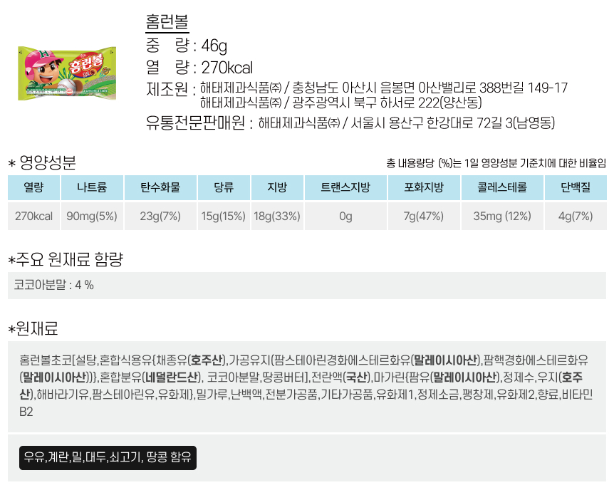| 품명 및 모델명 | 해태 홈런볼 초코(46g) |