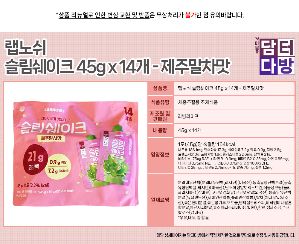 랩노쉬 슬림쉐이크 45g x 14개 - 제주말차맛