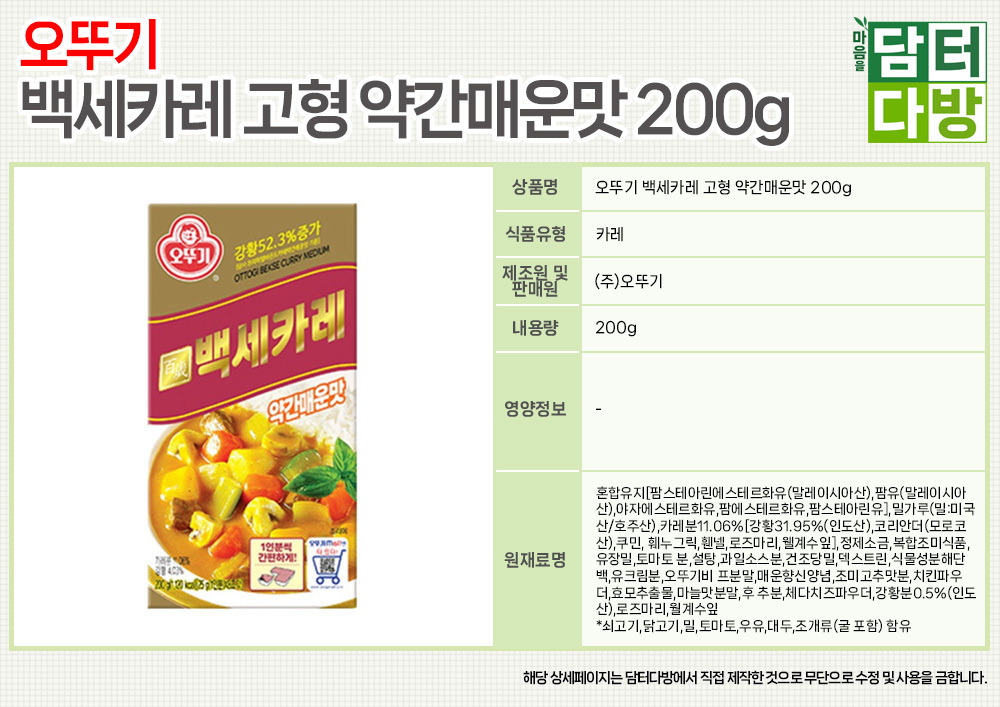 오뚜기 백세카레 고형 약간매운맛 200g x 4개