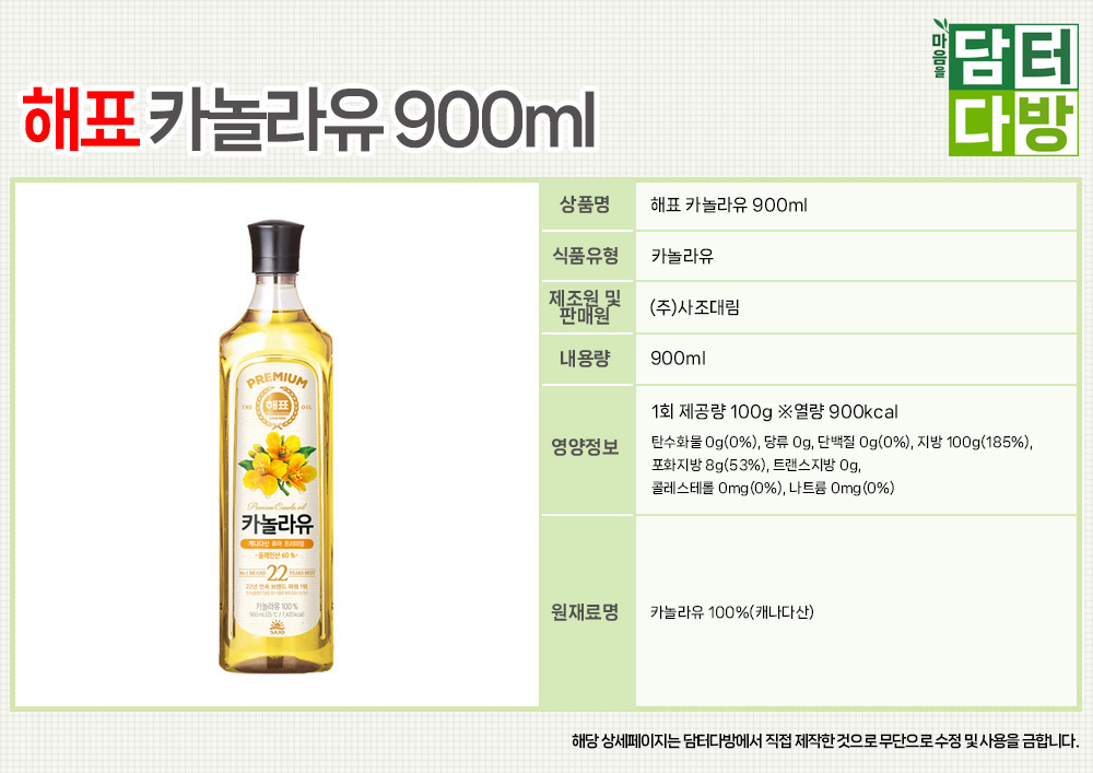 해표 카놀라유 900ml X 3개