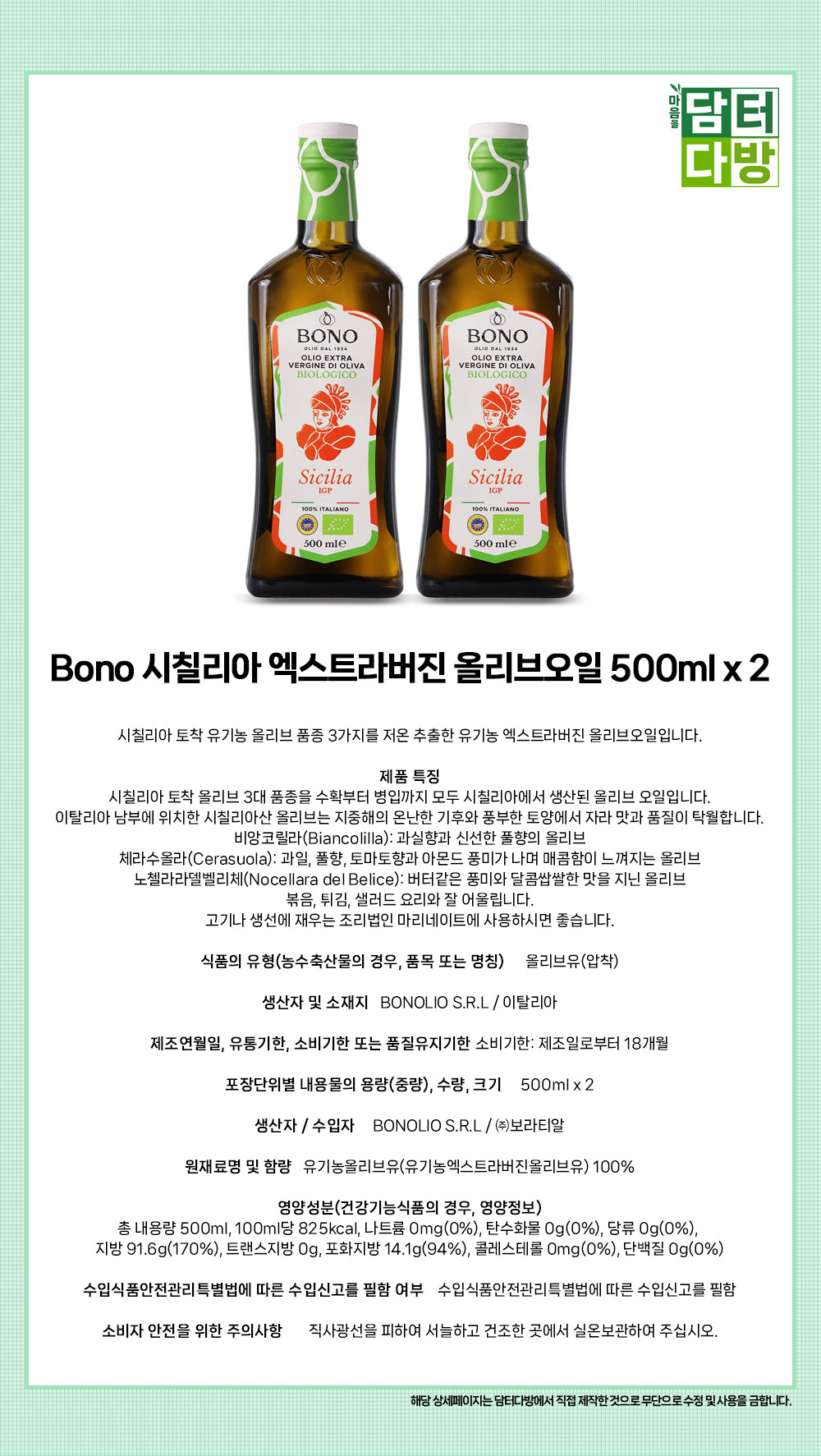 Bono 시칠리아 엑스트라버진 올리브오일 500ml x 2