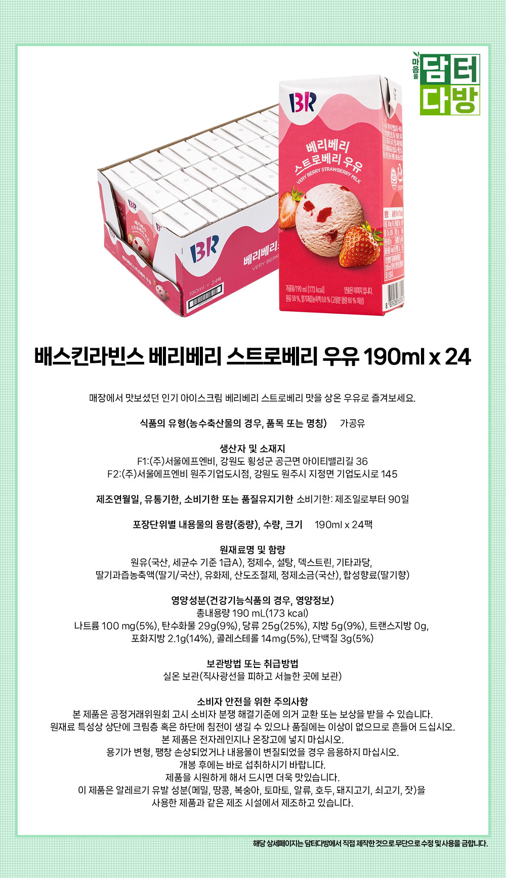 배스킨라빈스 베리베리 스트로베리 우유 190ml x 24