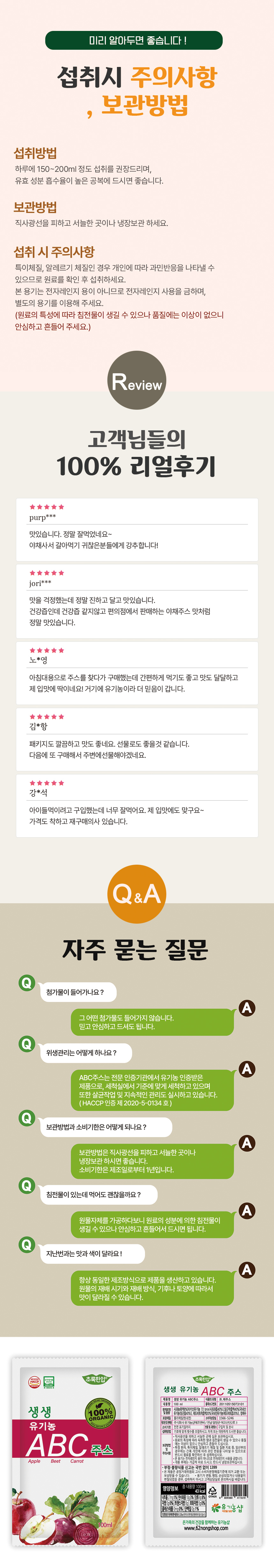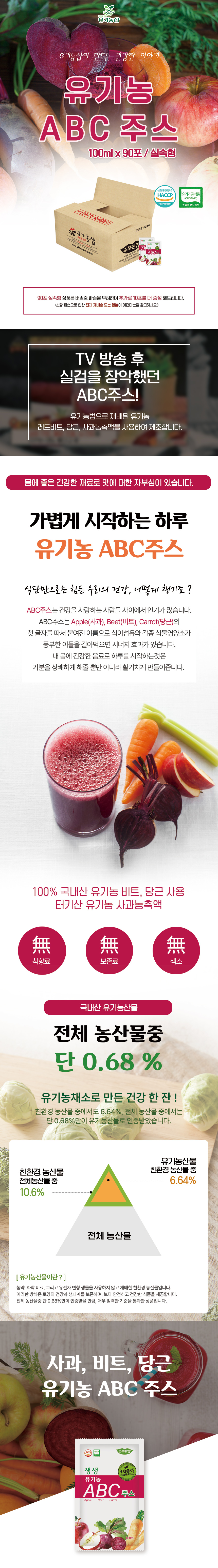 | 원재료명/함량 | 사과농축액8%[터키산유기농 72brix(사과과즙40%)],당근착즙액40%[국내산유기농(당근즙40%)],레드비트착즙액20%[국내산유기농(레드비트즙20%)] ,정제수 |
