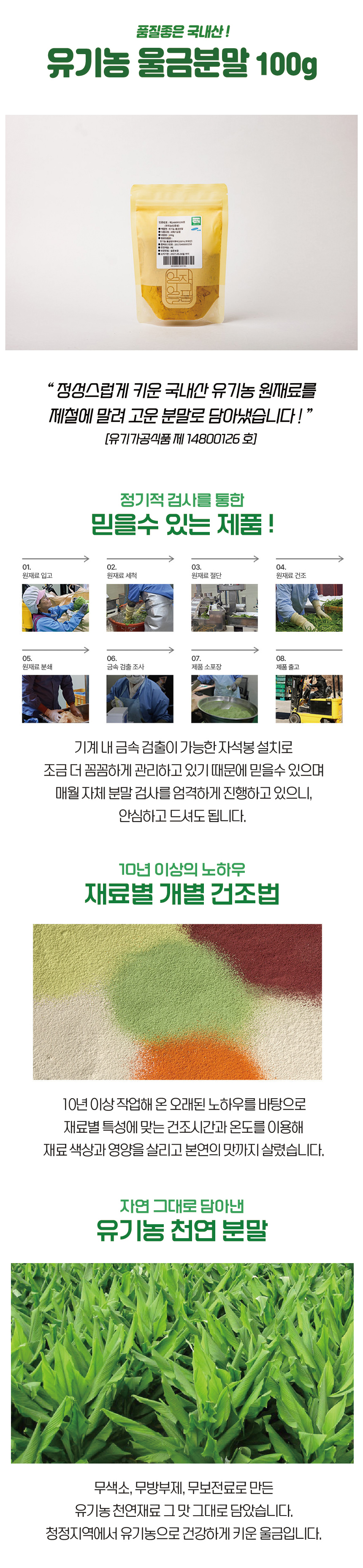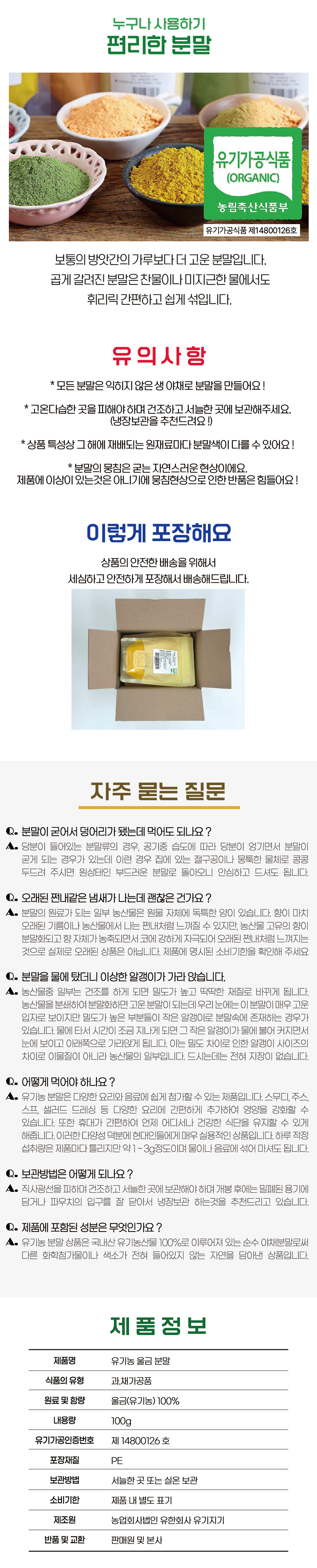| 원재료명/함량 | 유기농 울금분말(국내산) 100% |