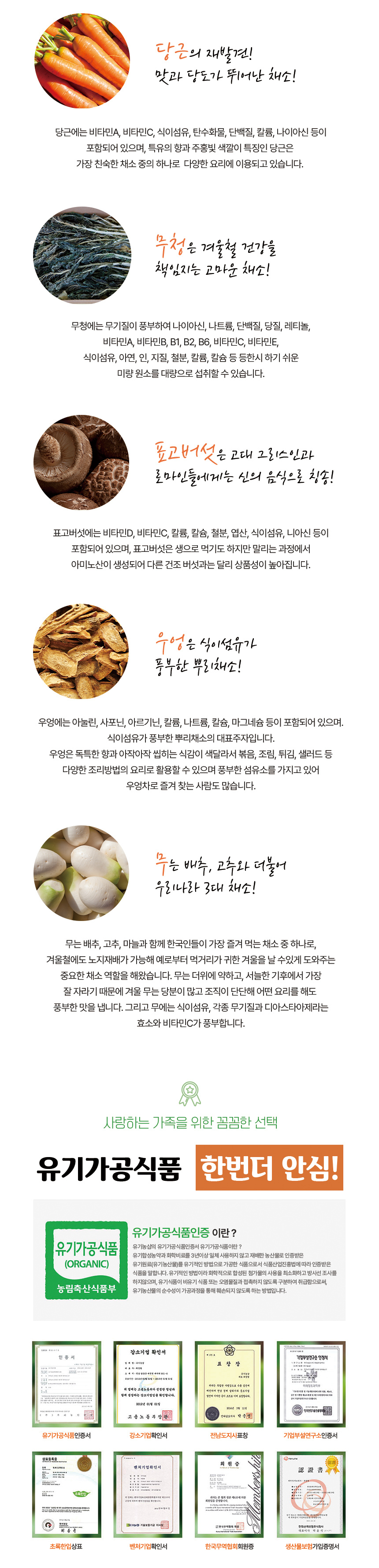 | 원재료명/함량 | 무(국내산유기농)12%,당근(국내산유기농)4%,우엉(국내산유기농)3%,말린무청(국내산유기농)0.3%,표고버섯(국내산유기농)0.3%,정제수 |