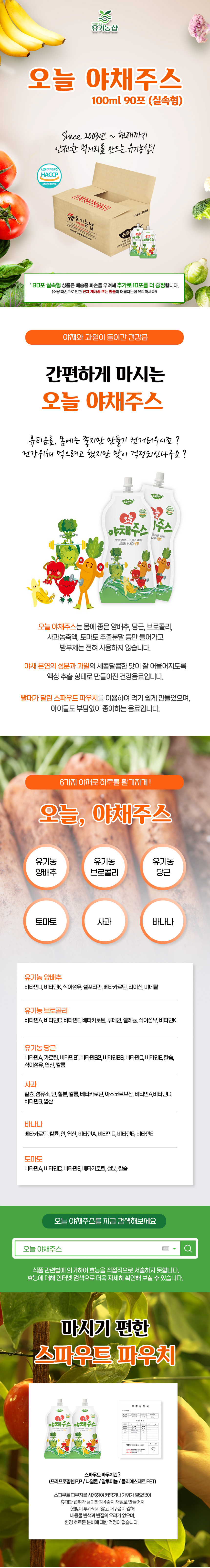 | 원재료명/함량 | 사과농축액6.9%(국내산72brix),당근농축액6.9%(국내산35brix),바나나농축액4.4%(이스라엘산65brix),토마토분말0.1%,(스페인산10brix),양배추농축액3.5%(국내산50brix),브로 콜리농축액0.1%(국내산16brix),정제수 |