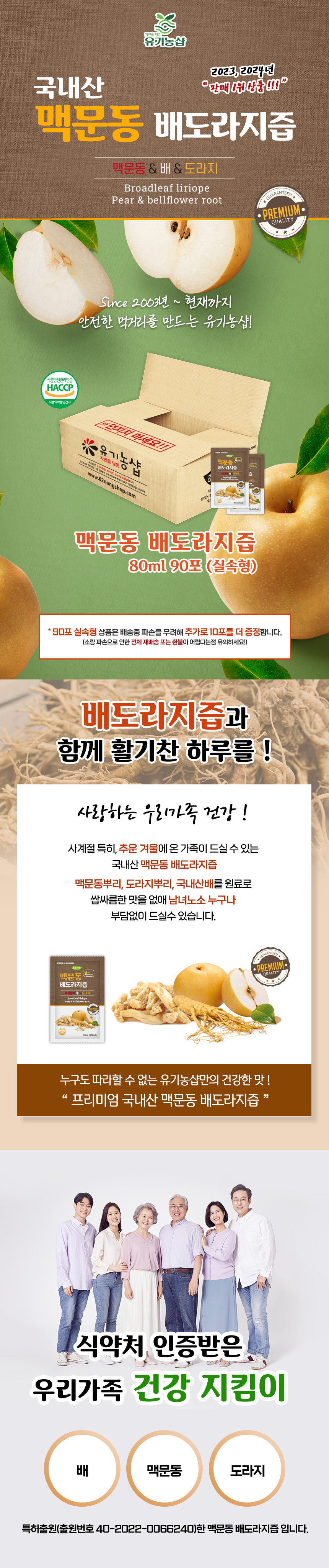 | 원재료명/함량 | 도라지혼합추출액81.1%[고형분2.7%이상,도라지70%(국내산),맥문동30%(국내산),정제수],배농축과즙18.9%(69Brix,국내산) |