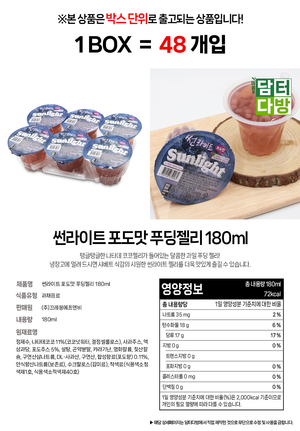 썬라이트 포도맛 푸딩젤리 180ml 1BOX (48개입)