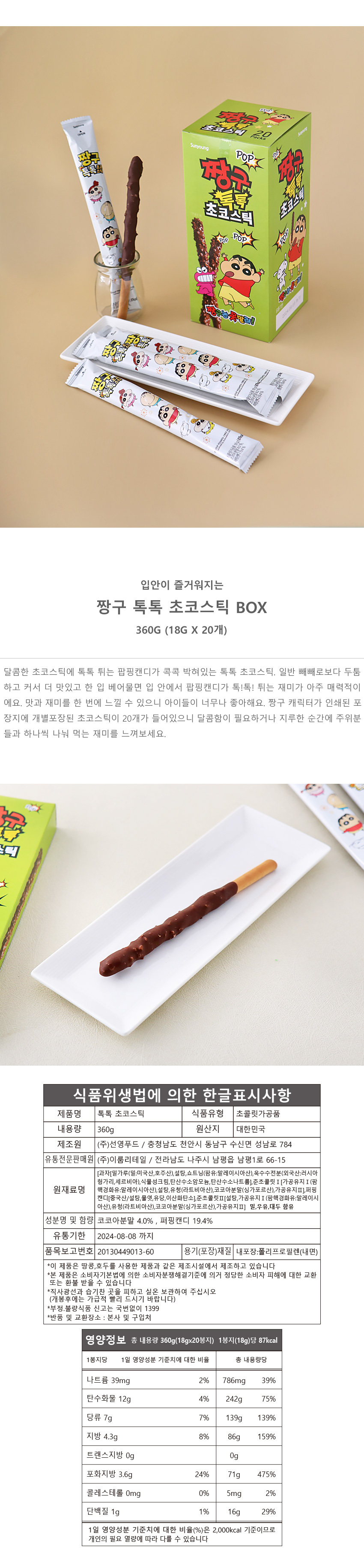 짱구 톡톡 초코 스틱 20개입 막대 과자 롱빼 선물