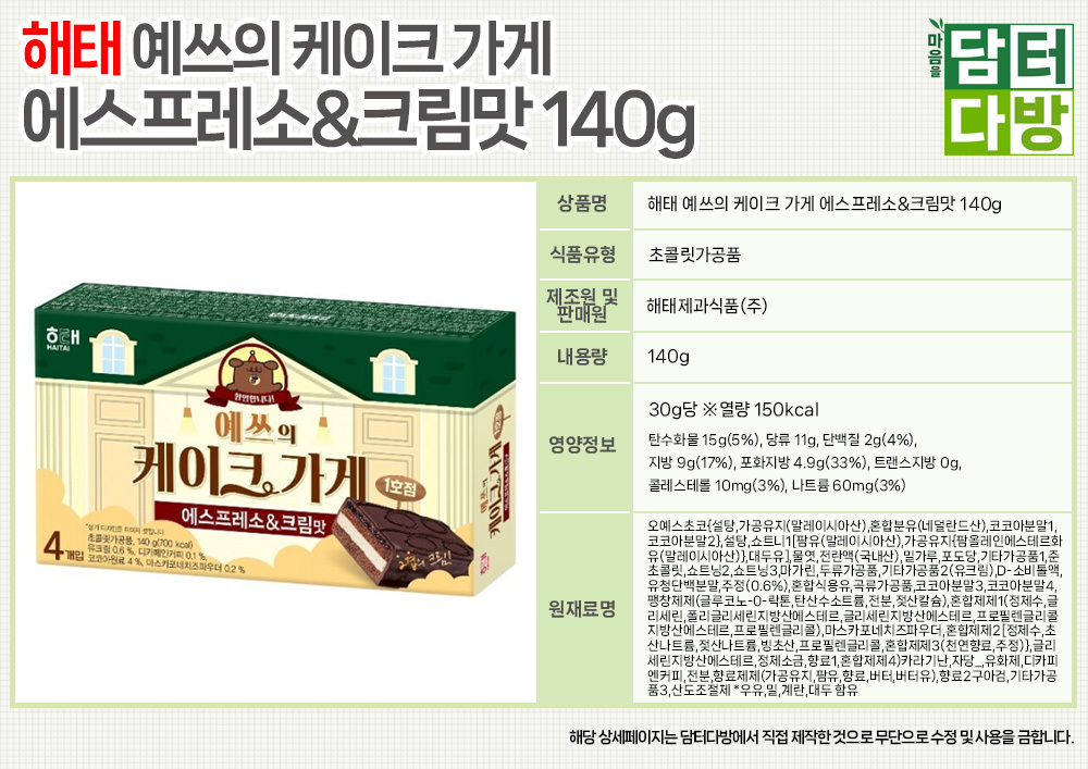 해태 예쓰의 케이크 가게 에스프레소&크림맛 140g X 4개