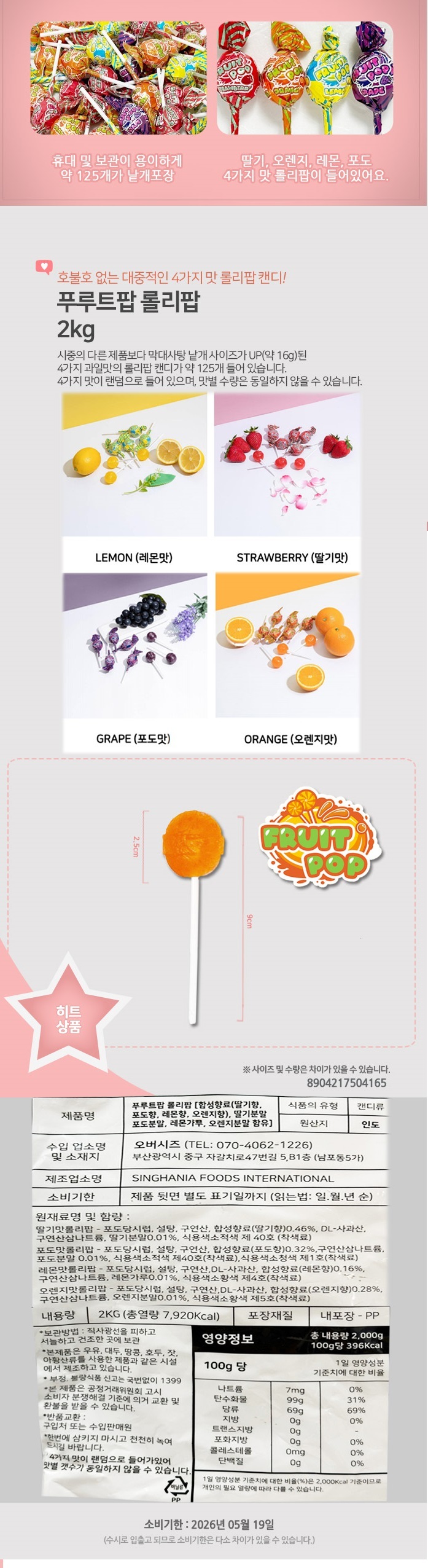 무배) 푸루트팝 롤리팝 막대 사탕 과일맛 대용량 캔디 2Kg X 1개