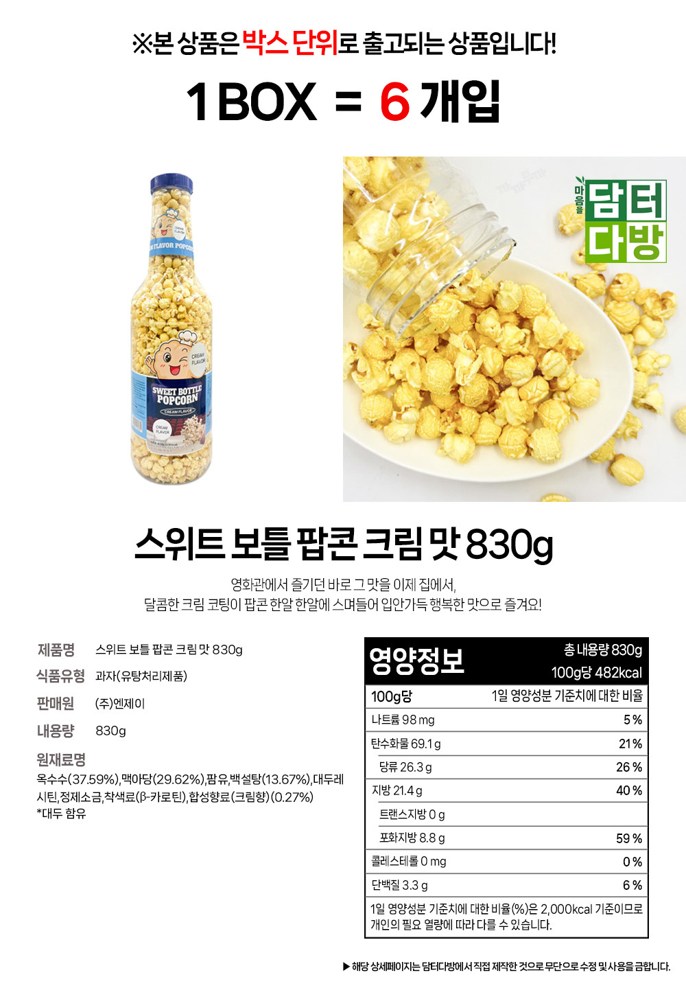 스위트 보틀 팝콘 크림 맛 830g 1BOX (6개입)