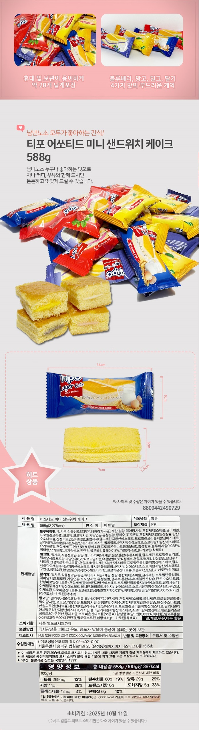 무배) 티포 어쏘티드 미니 샌드위치 케이크 대용량 빵 588g X 1개