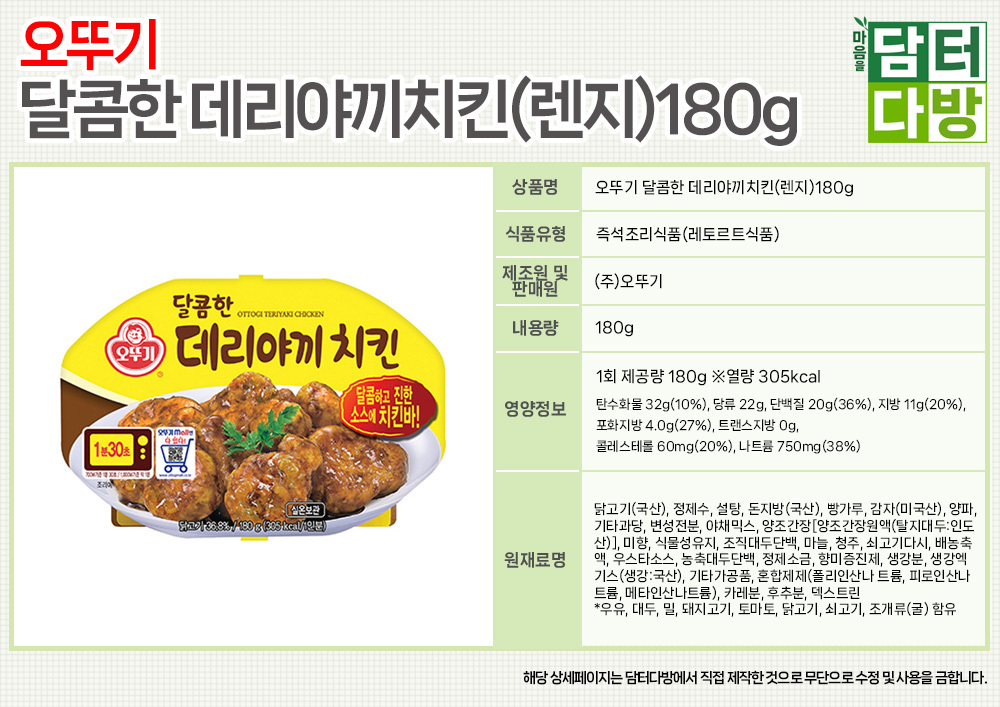 오뚜기 달콤한 데리야끼치킨(렌지)180g X 12개